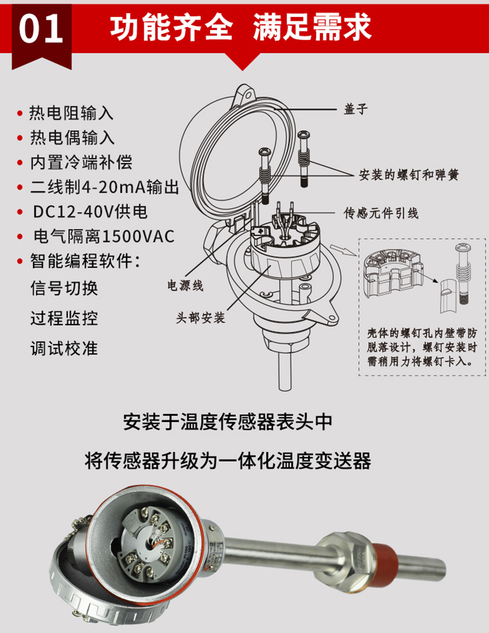 溫度變送器將現(xiàn)場的熱電阻或熱電偶等溫度傳感器信號經(jīng)過隔離放大處理,轉(zhuǎn)換為與溫度成線性的二線制4-20mA信號輸出至控制系統(tǒng)。