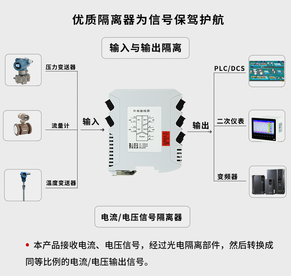 OHR-M31系列智能隔離器將直流電壓或電流信號(hào)經(jīng)過隔離傳送,轉(zhuǎn)換成所需的信號(hào)給其它儀表。可以與單元組合儀表及DCS、PLC等系統(tǒng)配套使用,給予現(xiàn)場(chǎng)儀表信號(hào)隔離、信號(hào)轉(zhuǎn)換、信號(hào)分配、信號(hào)處理等,從而提高工業(yè)生產(chǎn)過程自動(dòng)控制系統(tǒng)的抗干擾能力,保證系統(tǒng)的穩(wěn)定性和可靠性。